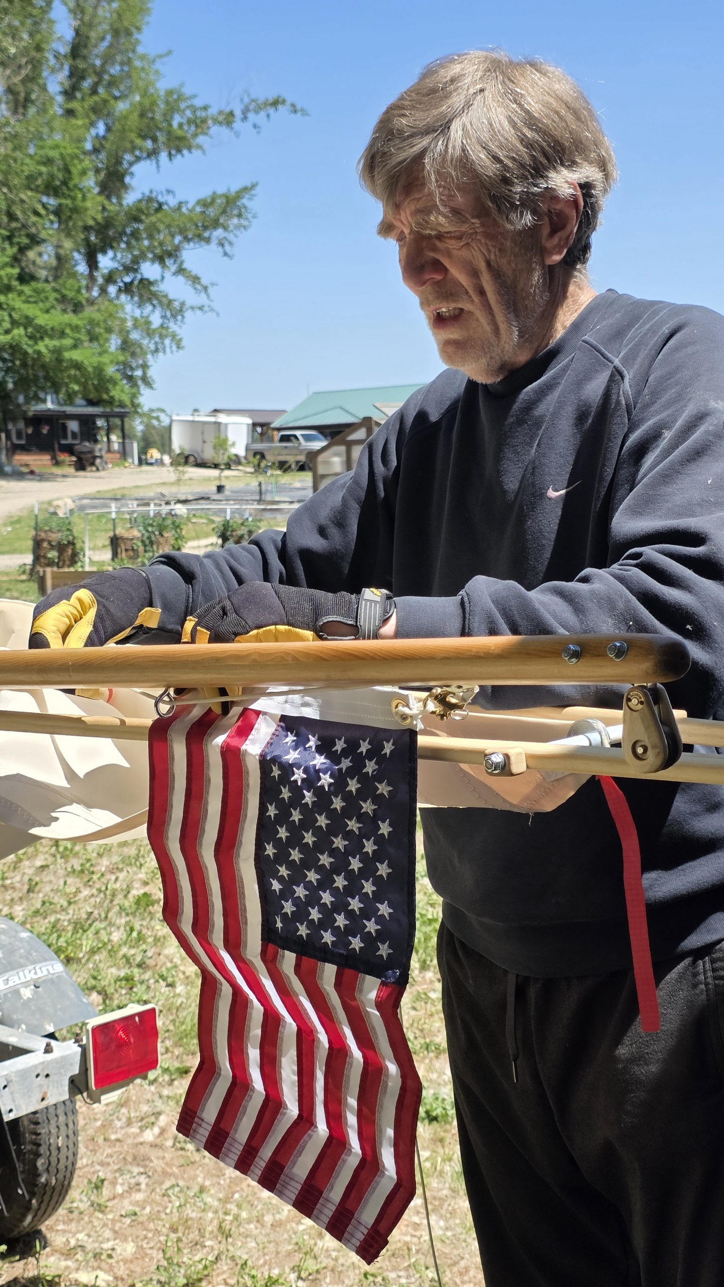 His mast will feature a removable top section for transport, a new external sail track for the sprit sail, and a smart reefing setup so he can reduce sail in seconds. True to Robert’s tidy nature, everything including mast, sprit, and sail will stow neatly inside the boat for transport on its trailer.